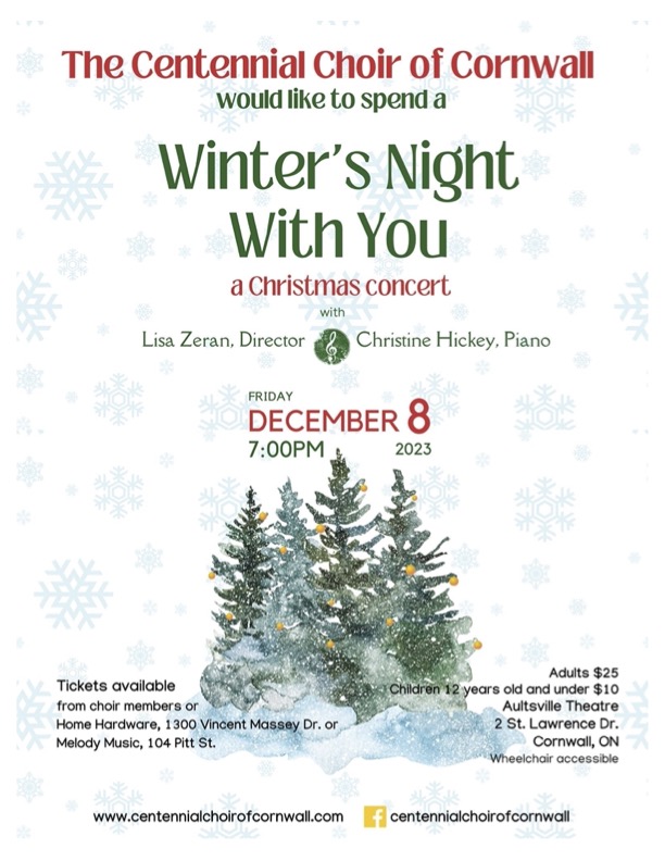 The Centennial Choir of Cornwall will celebrate their Christmas Concert, Winter’s Night with You, at Aultsville Theatre on Friday, December 8 at 7:00 pm. The choir will sing of coming home, the joy and silence of the Christmas season and the longing to be together. The African Advent Carol and O Mary, What a Baby Boy will fill you with rhythmic glee. The choir is led by Lisa Zeran, accompanied by Christine Hickey, both accomplished musicians.