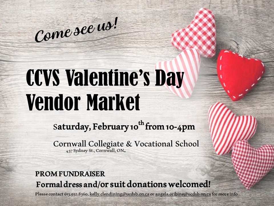 CCVS Valentine’s Day Vendor Market Where Cornwall Collegiate and Vocational School, 437 Sydney St, Cornwall, ON Map When Feb 10/24 10:00 AM - Feb 10/24 04:00 PM Age All Website https://www.facebook.com/events/s/valentines-day-vendor-market/646750594125893/?mibextid=9VsGKo