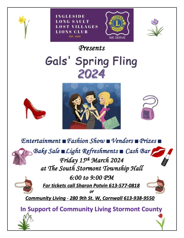 The Ingleside Long Sault Lost Villages Lions Club is hosting a Gal’s Spring Fling 2024 in support of Community Living Stormont County. A night filled with vendors, prizes, auction table, bake sale, entertainment and a great fashion show. A light lunch will be served and a cash bar will be available. Please join us for a fun filled evening! Limited amount of tickets being sold, so to avoid disappointment, get yours early. Advance ticket sales only!