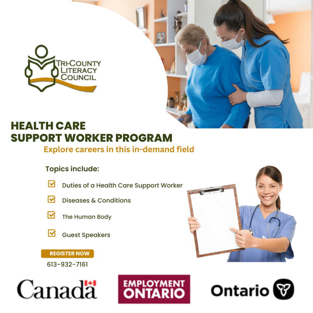 Do you like to care for others?  Do you have an interest in working in the health care field?  Tri-County Literacy Council, 101 2nd Street West, Cornwall, ON is pleased to offer free 6-week training: Health Care Support Worker starting April 8, 2024.  In Canada, the population is aging and the need for more support for ailing and disabled individuals is increasing.  The health care support worker profession is an emerging field of employment.    Assisting with bedside and personal care to clients, planning and preparing meals, helping with light housework, and spending time talking to clients are typical duties of a health care support worker. Participants will have the opportunity to learn about: