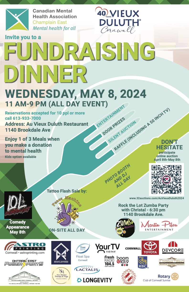 Au Vieux Duluth Fundraising Dinner Where Au Vieux Duluth Restaurant, 1140 Brookdale Ave, Cornwall, ON Map When May 08/24 11:00 AM - May 08/24 09:00 PM Age All Website https://www.facebook.com/cmhaeast
