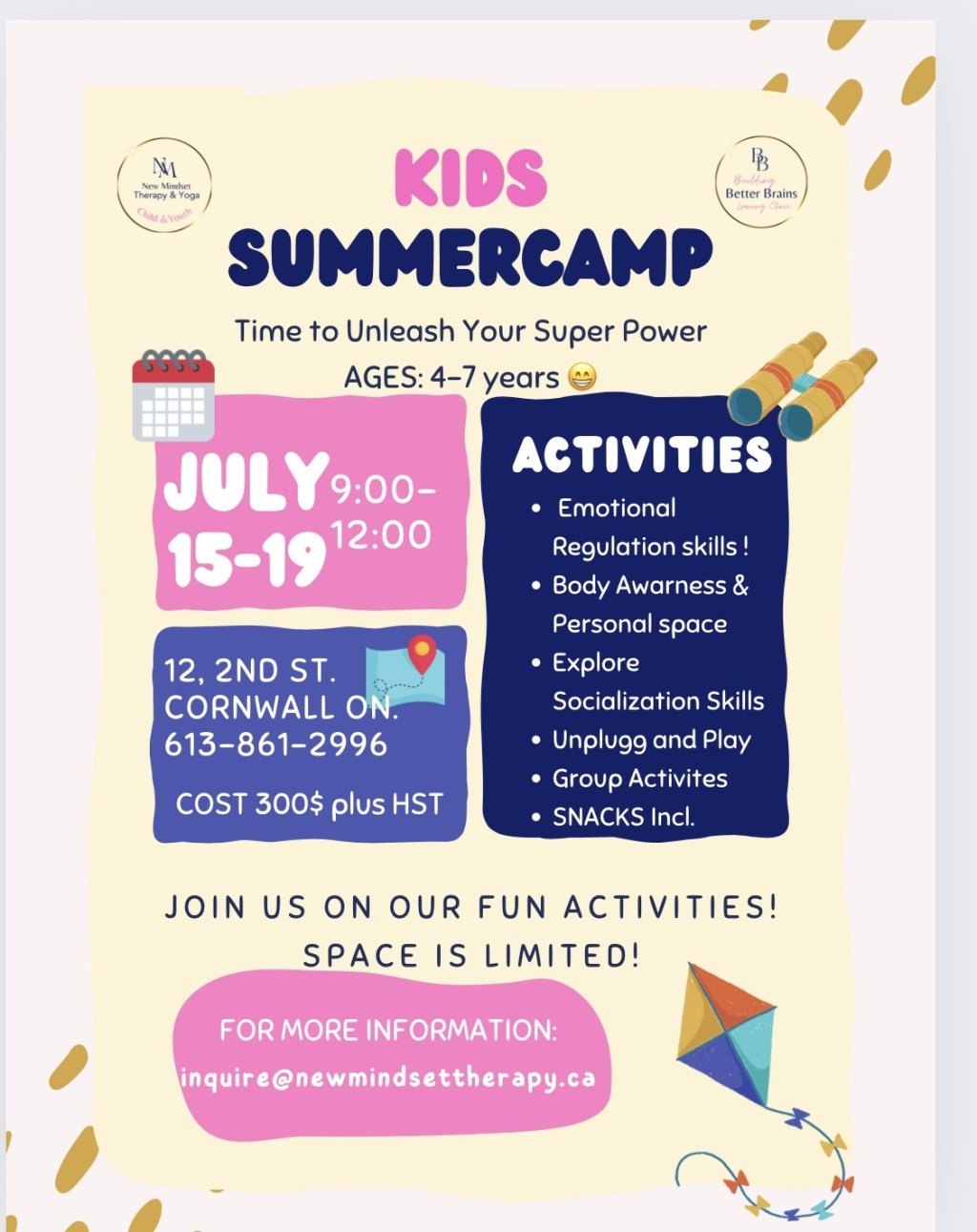 Kids Summercamp Where 12, Second St , Cornwall, ON Map When Jul 15/24 09:00 AM - Jul 19/24 12:00 PM Age All Price Starting at $300