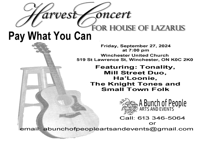 HARVEST CONCERT for House of Lazarus Outreach Mission Where Winchester United Pastoral Charge, 519 St. Lawrence St, Winchester, ON, K0C 2K0 Map When Sep 27/24 07:00 PM - Sep 27/24 08:00 PM Age All
