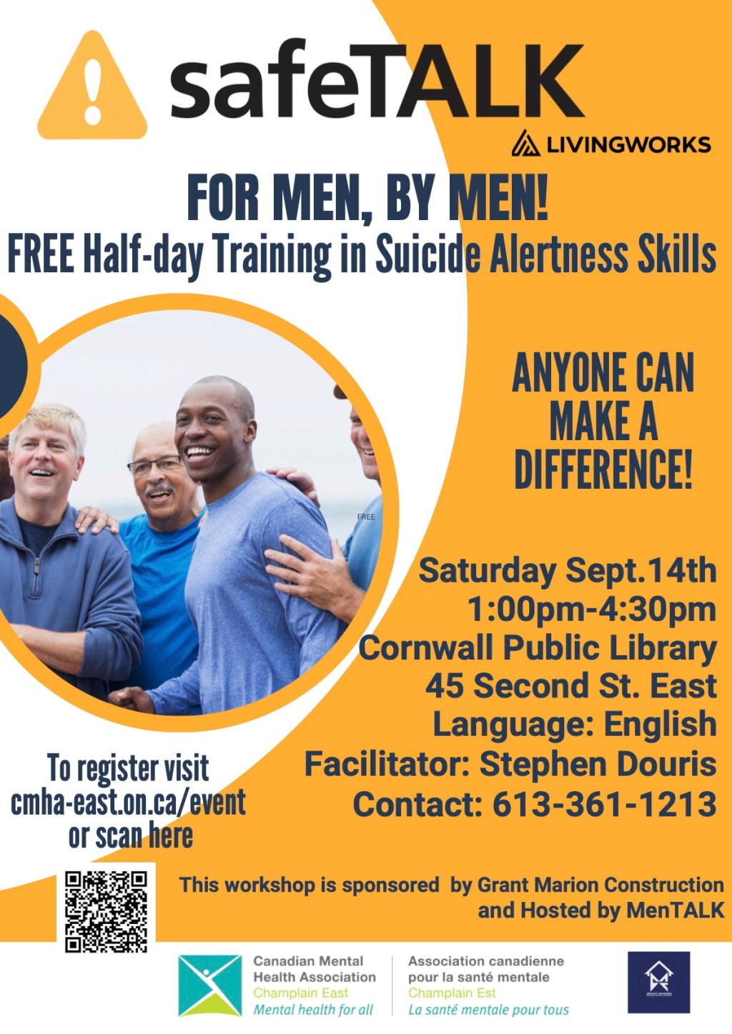 Suicide Prevention Training for Men by Men Where Cornwall Public Library 2nd floor, Cornwall, ON Map When Sep 14/24 01:00 PM - Sep 14/24 04:30 PM Age All