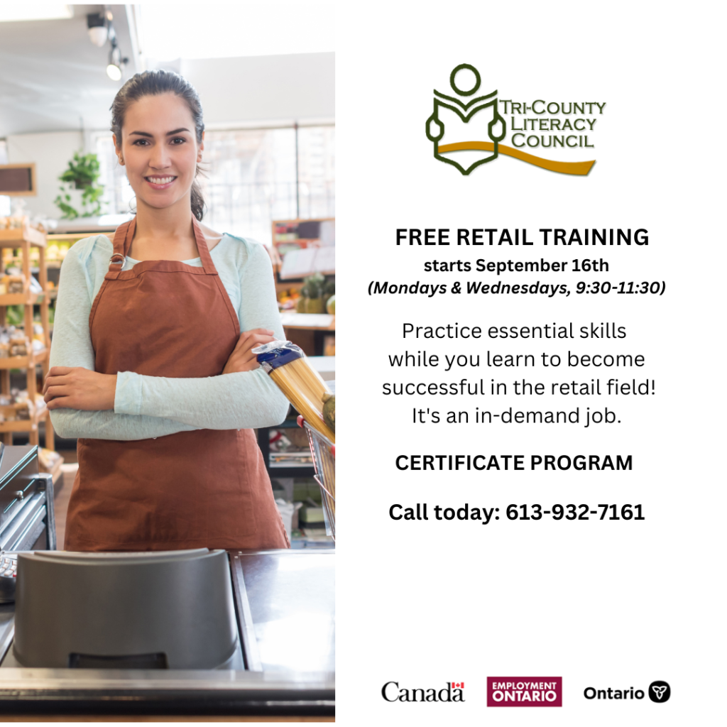 Get a head start with your job search and gain the essential skills needed to be successful in the Retail Sector. This program is ideal for anyone planning to work at a retail business such as a clothing or grocery store. This training is suitable for a variety of learners including those planning to enter the workforce for the first time, people changing careers, and individuals wishing to strengthen Essential Skills. The training includes the world of retail, customer service, store procedures, communication skills, and guest speakers. To register call Tri-County Literacy Council