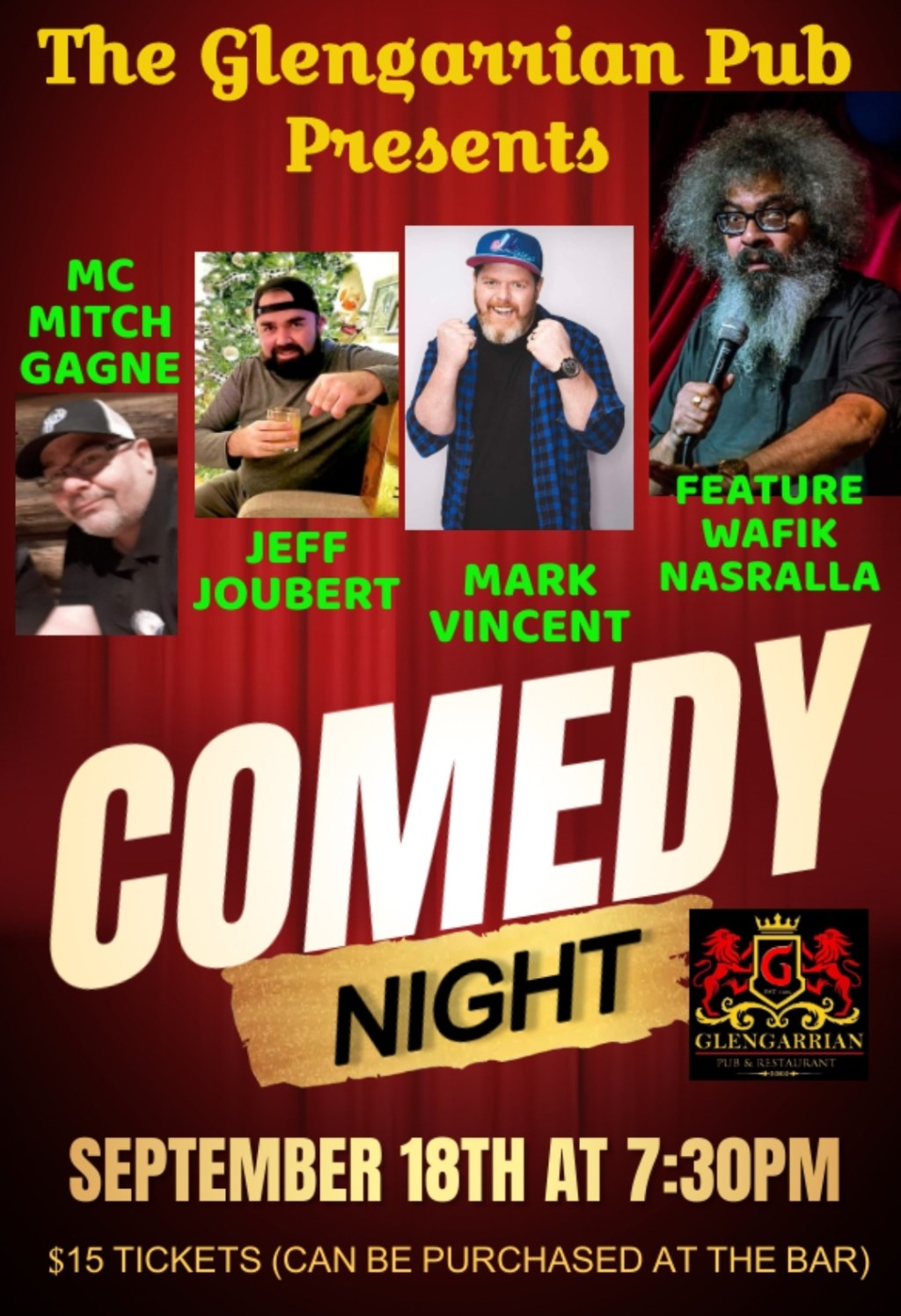 Comedy Night at The Glengarrian Pub Where Glengarrian Pub, 841 Sydney St #9, Cornwall, ON Map When Sep 18/24 07:30 PM - Sep 18/24 09:00 PM Age All Price Starting at $15.00