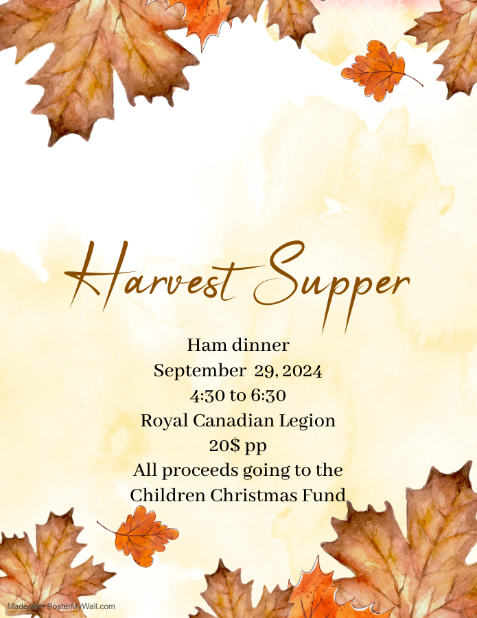 Harvest Supper Where Royal Canadian Legion, 415 Second St W, Cornwall, ON Map When Sep 29/24 04:30 PM - Sep 29/24 06:30 PM Age All Price Starting at $20.00/person