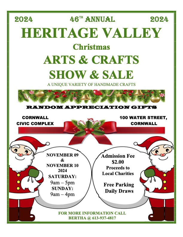 Heritage Christmas Arts and Craft Show & Sale Where Cornwall Civic Complex, 100 Water Street, Cornwall, ON Map When Nov 09/24 09:00 AM - Nov 10/24 03:00 PM Age All