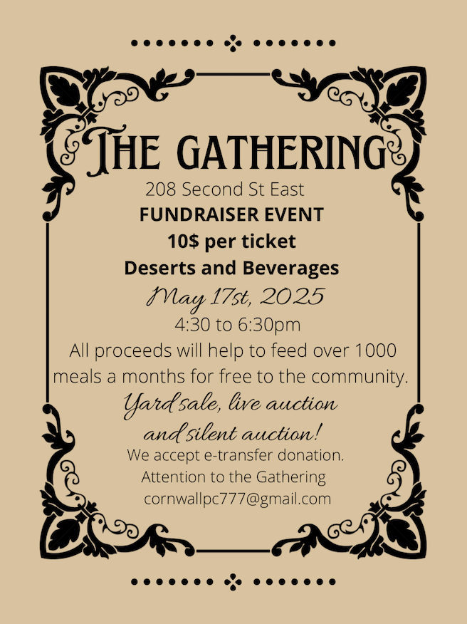 The Gathering Where Cornwall Pentecostal Church, 208 Second St. E., Cornwall, ON Map When May 17/25 04:30 PM - May 17/25 06:30 PM Age All Desserts, Live Auction, Silent Auction, Garage Sale Items & Lots of Prizes. Admissions is $10