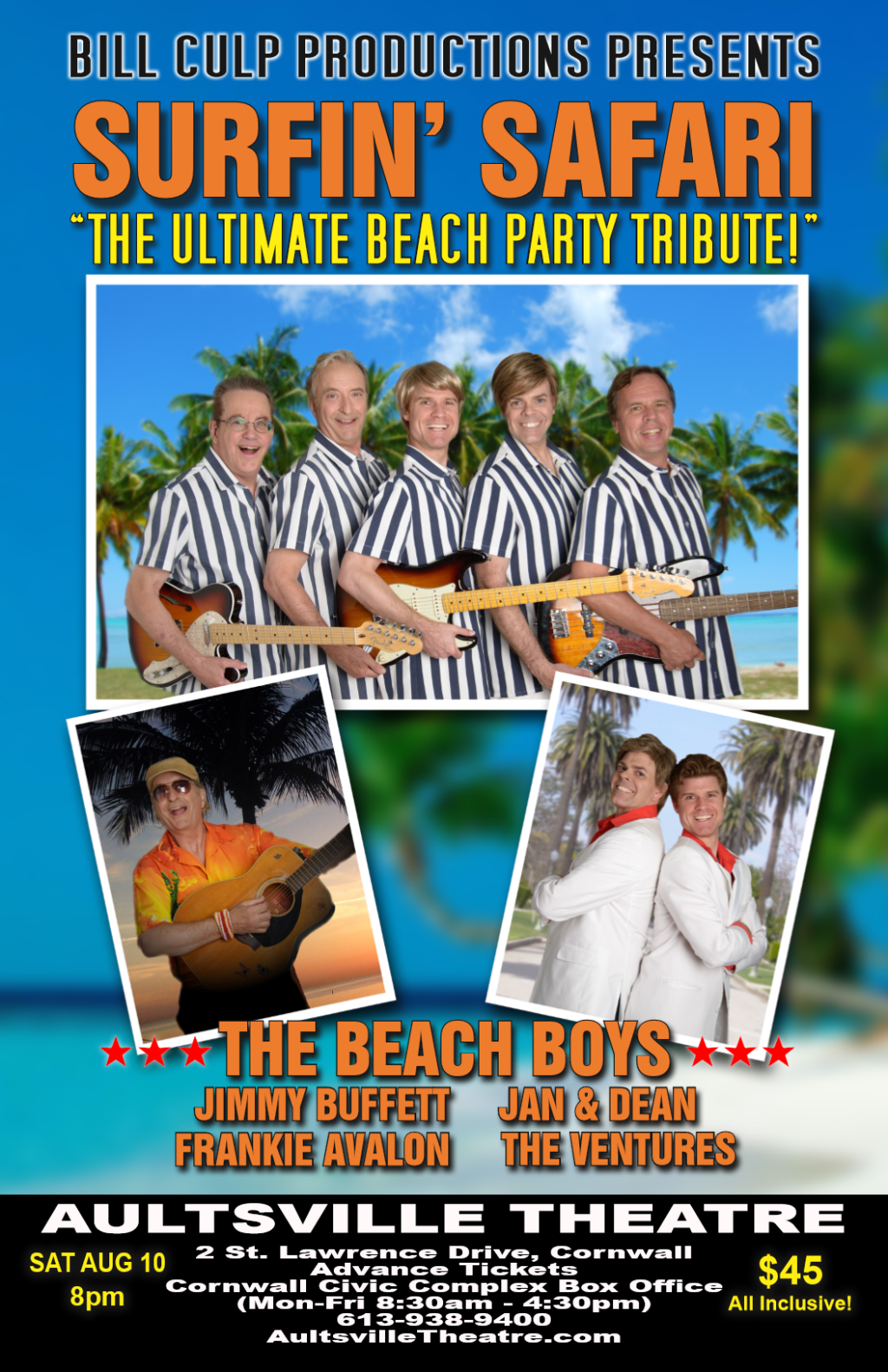 “Surfin’ Safari: The Ultimate Beach Party Show” celebrates the music of Jimmy Buffet, Frankie Avalon, Jan & Dean, The Ventures, and of course …The Beach Boys! Don’t miss this fun-filled, audience interactive “beach party show” that combines fabulous musical tributes with an outstanding live band. Song highlights include “Surfin’ USA”, “Margaritaville”, “Surf City”, “It’s 5 O’Clock Somewhere”, “California Girls” “Wipeout” and “Kokomo” amongst the many audience favourites. No matter what the weather is like, it’ll be warm and sunny on stage! Get ready to have some “Fun, Fun, Fun”!!