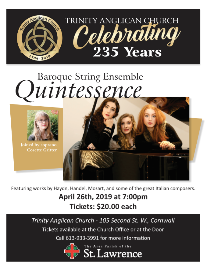 The Quintessence String Ensemble, a Baroque string ensemble will be performing at Trinity Anglican Church, 105 2nd St. west on April 26th at 7:00 p.m. Guest Soprano soloist with be Cosette Gritter. Tickets are available at the church office or at the door for $20 each.