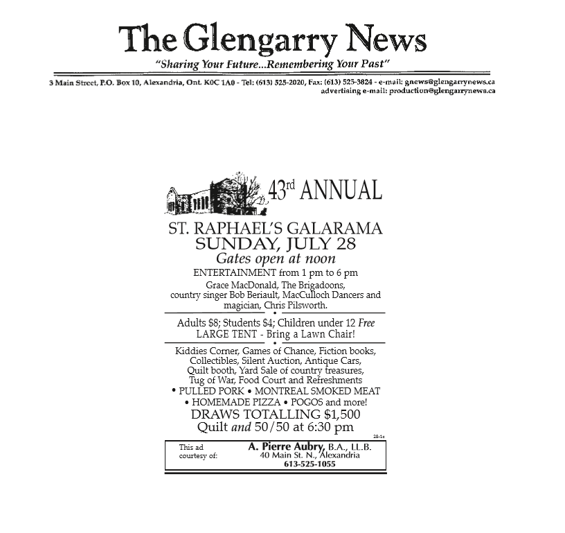 A warm and friendly Glengarry welcome awaits you on Sunday, July 28, at the 43rd Annual St. Raphael’s Galarama.