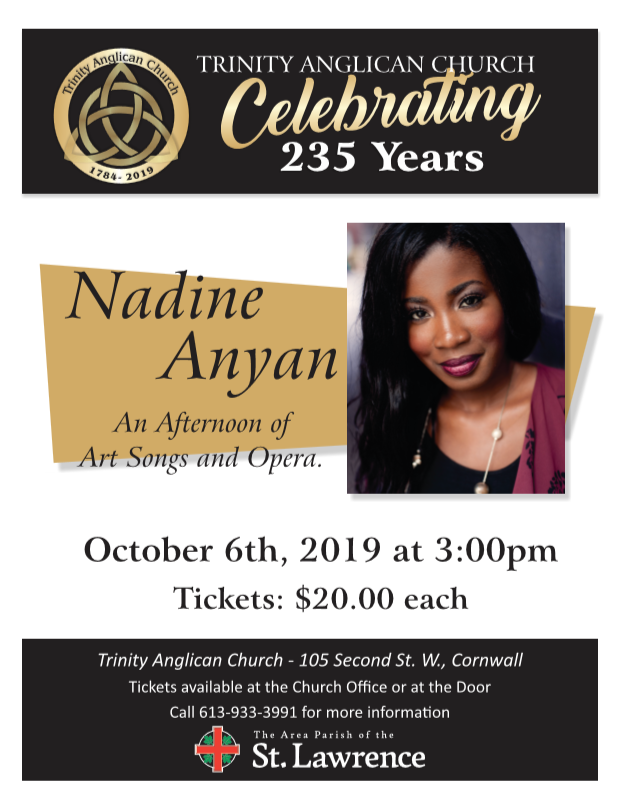 Soprano Soloist, Nadine Anyan, from Toronto will be performing a concert a Trinity Anglican Church on October 6th at 3:00 p.m.