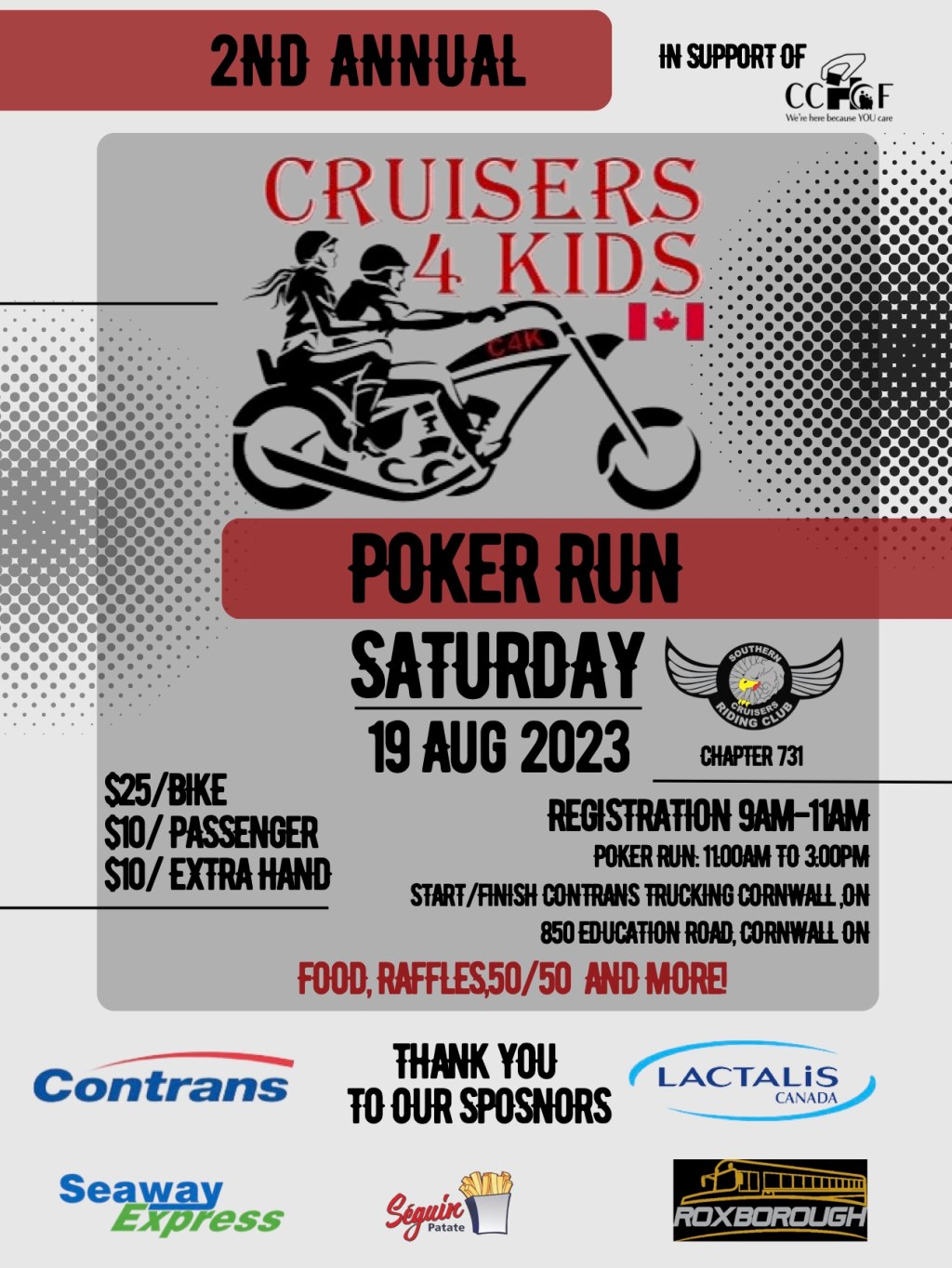 Registration is from 9 am till 11 amCost is $25 per rider and $10 per passenger and $10 for an extra handIt is a poker run with stops in lancaster Alexandria St. Alberts and CornwallPrizes and 50/50 draw at 4 pm