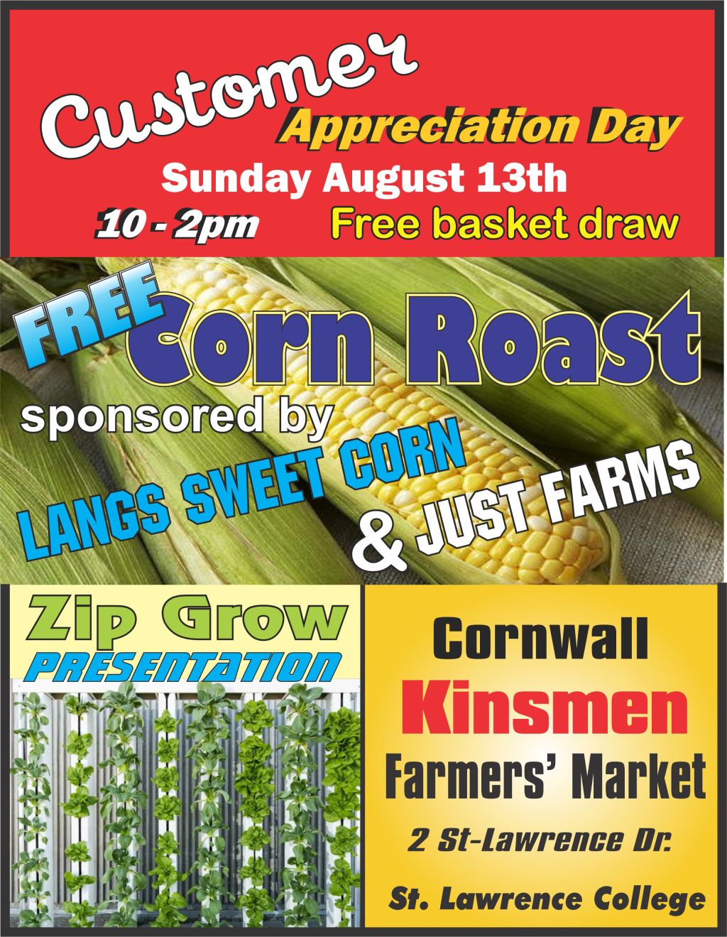 Customer Appreciation Day Where St. Lawrence College Map When Aug 13/23 10:00 AM - Aug 13/23 02:00 PM Age All Free corn roast sponsored by Langs Sweet Corn & Just Farms
