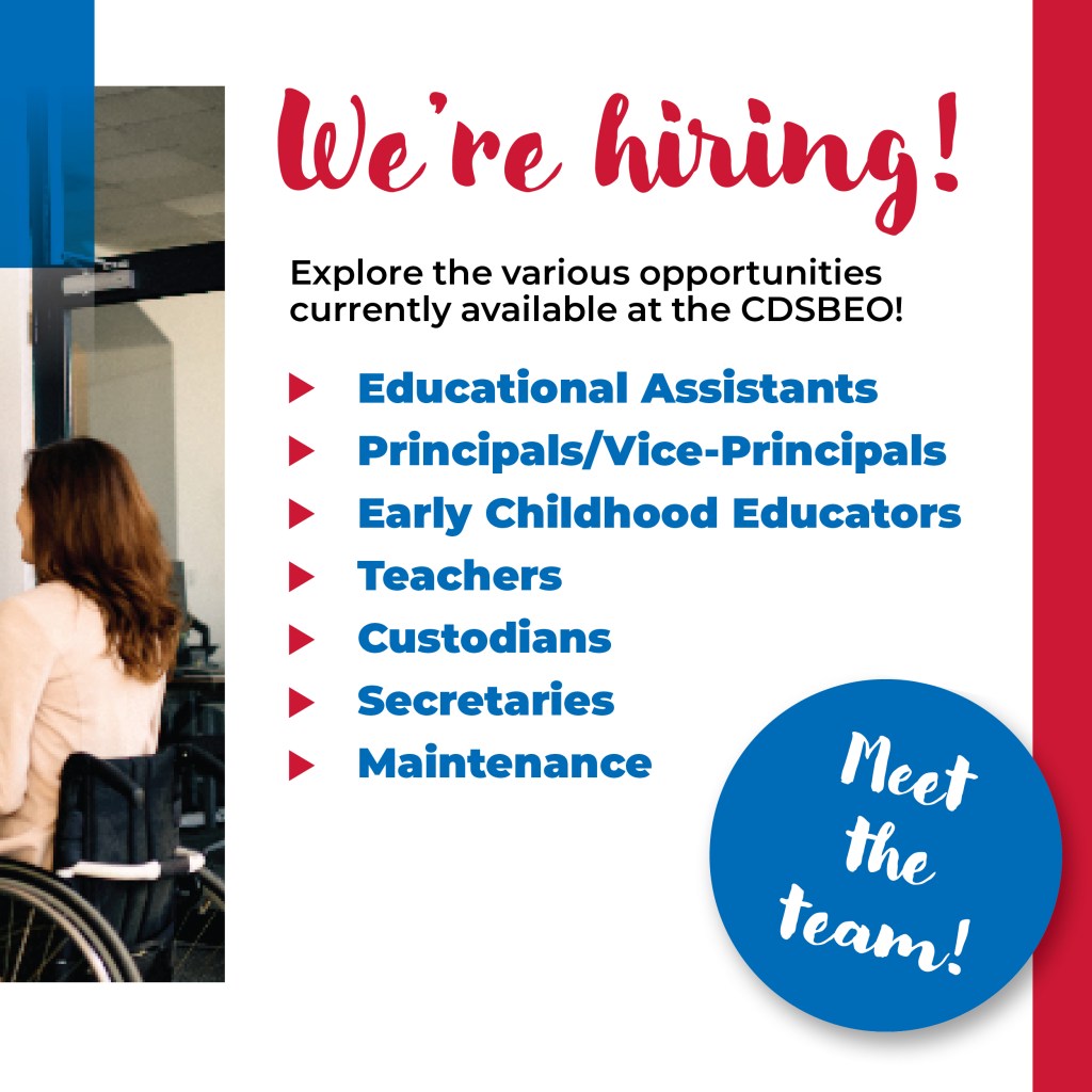 Join us for the CDSBEO Career Fair on November 28, in Cornwall! Meet the team and explore various opportunities currently available at the CDSBEO including openings for educational assistants, custodians, teachers, principals/vice-principals, early childhood educators, secretaries, maintenance professionals, and more!